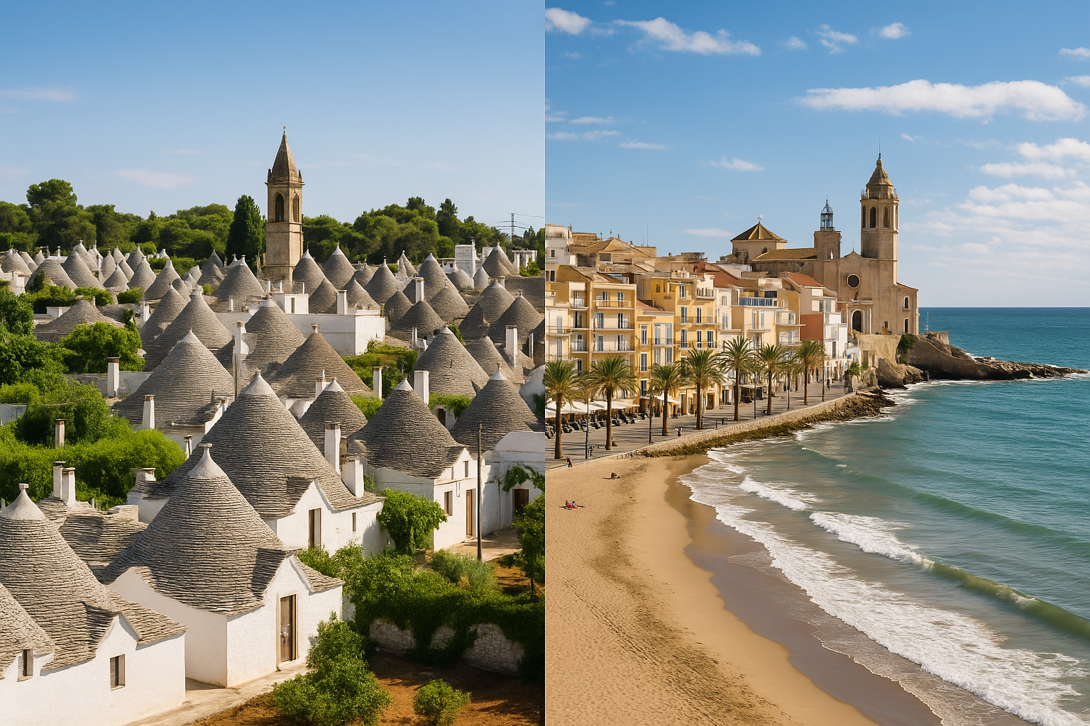 W przeciwieństwie do Puglii, popularne regiony Hiszpanii często charakteryzują się bardziej jednolitą, współczesną architekturą. Standardowe kompleksy apartamentowe i nowoczesne wille dominują w wielu hiszpańskich lokalizacjach turystycznych.